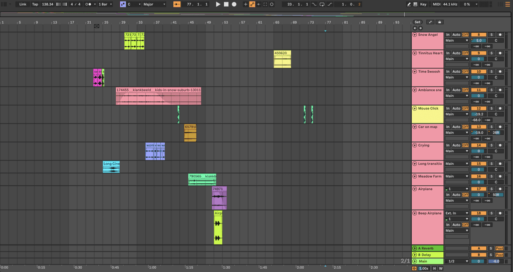 Ik gebruikte een combinatie van bestaande geluiden en geluiden die ik zelf maakte of bewerkte. Ik deed pitch-aanpassingen en ik gebruikte automation. Ook maakte ik zelf een riser bij het stuk dat de spanning oploopt als je de seizoenen voorbij ziet gaan. Zo kon ik de soundscape laten reageren op wat er in beeld gebeurde. Door dit te doen voelde het alsof de video en audio samen een verhaal vertelden, in plaats van twee losse onderdelen die toevallig tegelijk afspeelden.